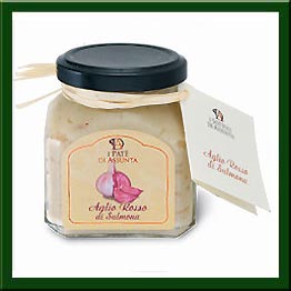 Ottenuto dalla riduzione in patè dello scapo fiorale dell'ecotipo Aglio Rosso di Sulmona amalgamato in olio extravergine d'oliva 100% italiano. Si accompagna su pietanze a base di carni rosse con formaggi stagionati, ottimo su crostini e bruschette.
