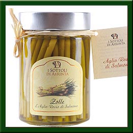 Tipico scapo fiorale dell'ecotipo Aglio Rosso di Sulmona in olio extravergine d'oliva 100% italiano. Si abbina a antipasti di carne e pesce, bruschette, piatti a base di legumi.
